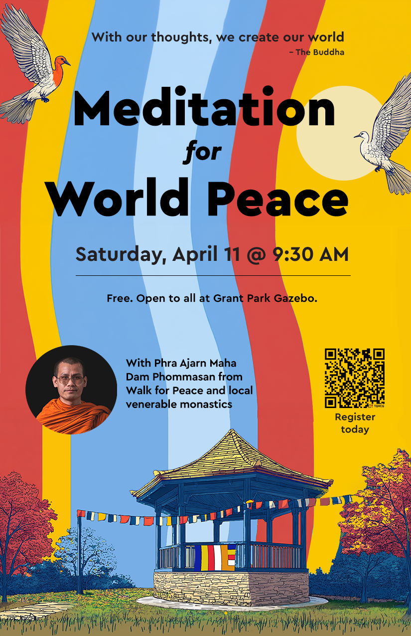 On Saturday, April 11th, please join us with Phra Ajarn Maha Dam Phommasan from Wat Lao Buddha Khanti Temple and local venerable monastics to set an intention for inner peace and the happiness of all beings. In Buddhist practice, peace begins within—through non-violence, loving-kindness, and mindfulness. The calm and compassion we cultivate in our hearts ripple outward to our families, communities, and the wider world.